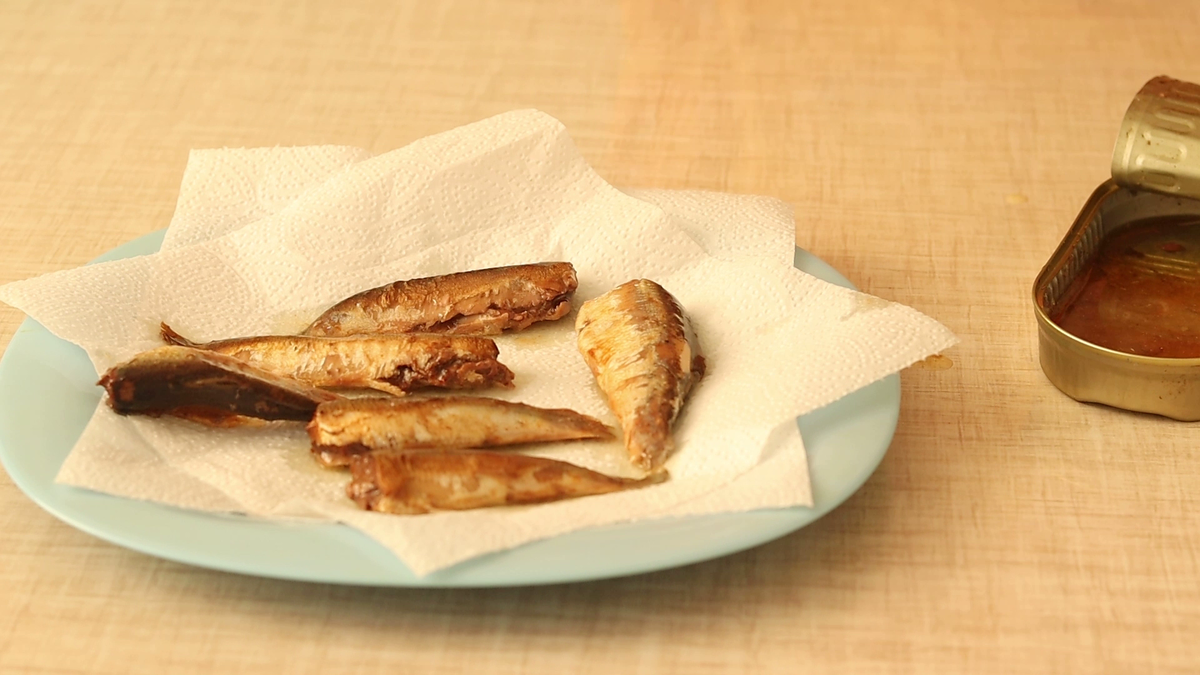 1. Начать нужно с подготовки шпрот. Их следует аккуратно выложить на салфетку, чтобы избавиться от лишнего масла. Теперь можно переходить к подготовке остальных ингредиентов.