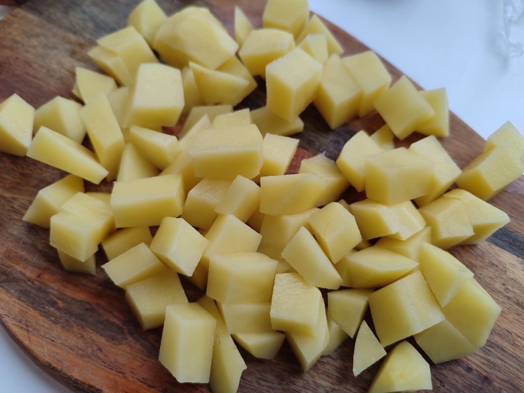 Начните с того, что налейте воду в кастрюлю и доведите до кипения. Тем временем подготовьте картошку: очистите и нарежьте на кубики. Опустите в кипящую воду и варите 15 минут. Не забудьте добавить соль ближе к концу варки, чтобы сохранить структуру картофеля.