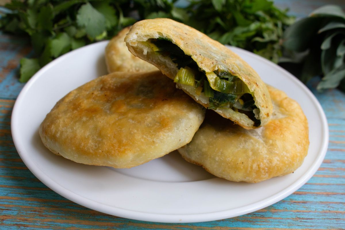 Тесто получается простым: вода, мука и чуть масла дают нужную эластичность. Важно сохранить баланс между тестом и начинкой, чтобы пирожок держал форму, но не превращался в резиновый шарик. Начинка же — свежая зелень с луком, заправленная солью и перцем — приносит яркость и душистость без излишних запахов и сложной подготовки.