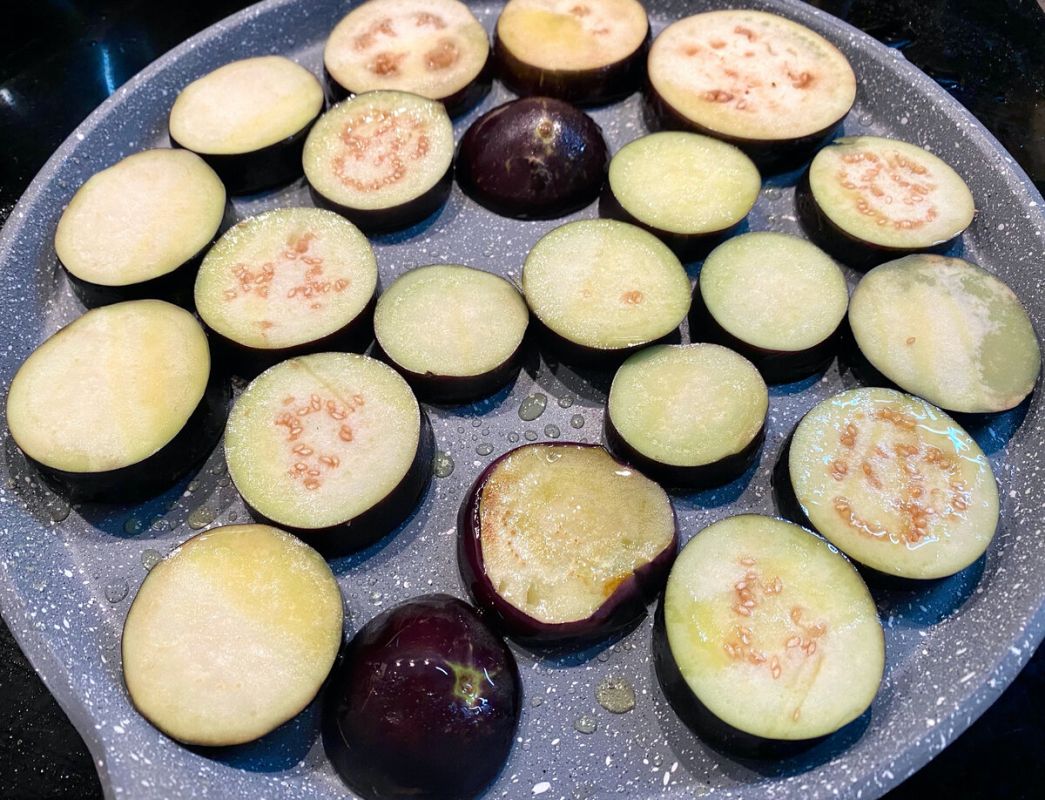 - баклажаны промыть, нарезать кружками, обжарить до румяной корочки;