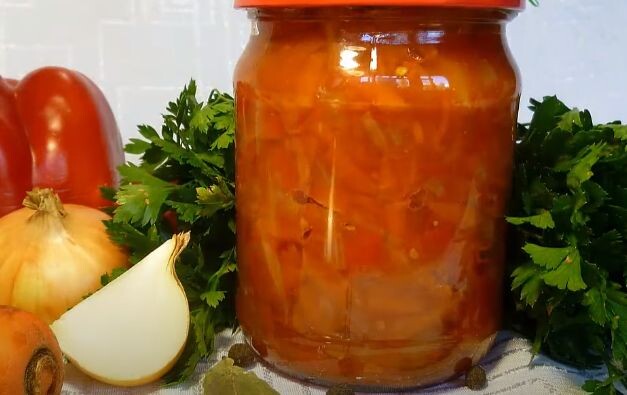 Приготовление: 1. Подготовка: нарезать перец соломкой, лук - полукольцами, морковь - брусочками. 2. Обжарить лук на растительном масле до золотистого цвета, далее добавить морковь. 3. Подготовить томатную заливку, смешав томатную пасту с водой, добавить в сковороду и довести до кипения с добавлением соли и сахара. Приготовить 10 минут. 4. Ввести перец и варить еще 20 минут, пока он не станет мягким. 5. Убрать лавровый лист, добавить лимонный сок, разлить по стерилизованным банкам и закрутить. 6. Хранить в темном, прохладном месте.