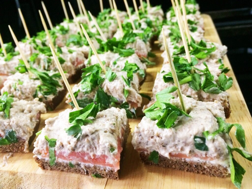 Нанесите пасту сверху на рыбу, украсив зеленым луком или другой зеленью по вашему выбору. Разрежьте каждый кусочек на четыре аппетитных канапе и вставьте зубочистки. Вот и все!