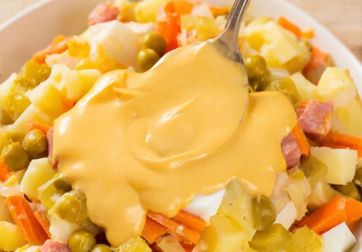- Соус для салата «Оливье»: 200 г - 150 г греческого йогурта, 2 вареных желтка, 1 ст. л. оливкового масла, 1 ч. л. горчицы, 1 ч. л. лимонного сока, соль, перец и сахар по вкусу.