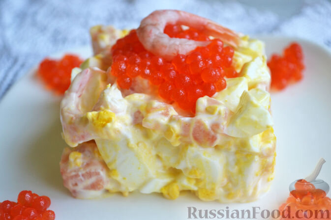 На сладкое можно предложить изысканный салат "По-царски" с сёмгой, креветками и красной икрой, который непременно привлечет внимание своих гостей.
