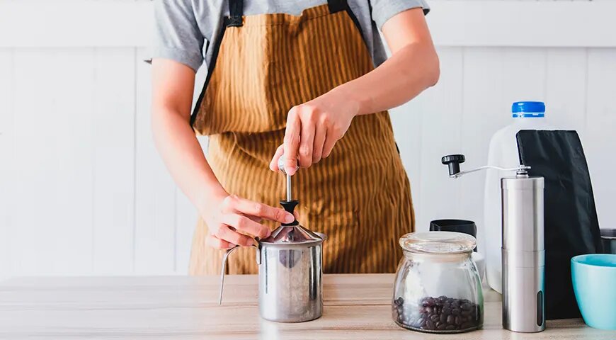 - Френч-пресс: Этот бюджетный метод включает движение поршня вверх-вниз, создающее давление, которое заполняет молоко пузырьками воздуха. Нагрейте молоко до 60–65°C, налейте в френч-пресс на 1/3 и взбивайте 20–30 секунд. Позвольте пене стабилизироваться затем.
