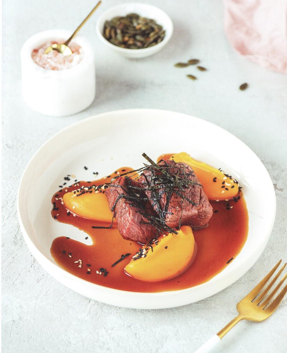 При подаче на стол по центру тарелки располагают тыквенный крем, сверху укладывают куски обжаренной говядины, после чего соус демигляс поливают горячим. Для завершения оформления блюда можно добавить кунжут и нарезанные соломкой водоросли нори, что придаст блюду изысканный вид и дополнит его вкус.