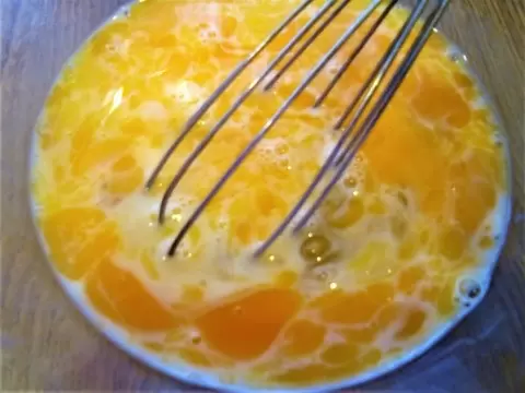 Первый шаг — подготовка яиц. Необходимо разбить шесть яиц в жаропрочную миску и добавить молоко, после чего тщательно взбить полученную массу с добавлением соли и перца. Лучше воспользоваться венчиком для достижения однородной консистенции.