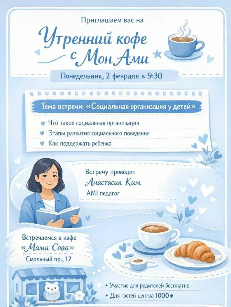 Приглашаем на уникальное событие «Утренний кофе с Мон Ами», которое пройдет в понедельник, 2 февраля, в 9:30. Это отличная возможность погрузиться в мир социальной организации, способствующий развитию детей.