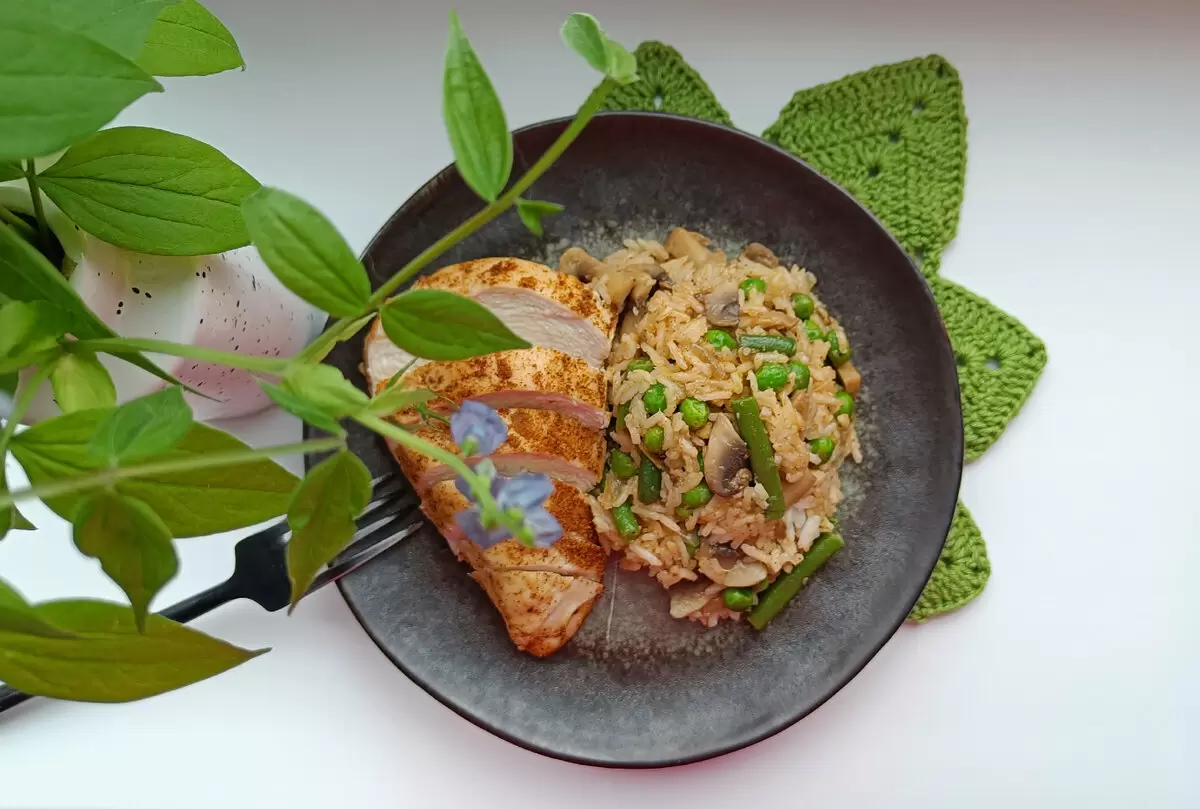 - Ингредиенты: 1 стакан риса басмати, 2 стакана воды, 150 г шампиньонов, 100 г зелёного горошка, 100 г стручковой фасоли, 50 г репчатого лука, 20 г сливочного масла, специи по вкусу (соль, перец, копчёная паприка, сушёный чеснок).