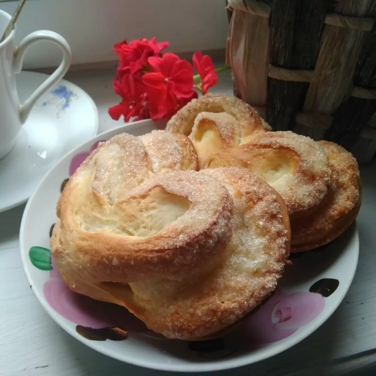 Каждый шарик аккуратно придайте форму лепешки толщиной около 0,5 см, смажьте оставшимся маслом и посыпьте сахаром. По одной десертной ложке сахара рекомендуется положить в центр каждой лепешки, равномерно распределив его по поверхности. Затем сверните лепешку в трубочку, защипнув края, и соедините концы, чтобы образовалось сердечко.