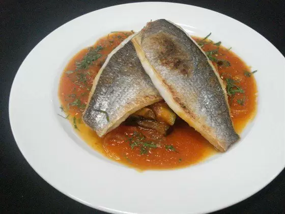 Начать с приготовления томатного соуса: очистить морковь, 40 г лука и 5 г чеснока.Нарезать морковь и лук крупными кубиками, обжарить на сливочном масле до легкой золотистой корочки. Мелко порубить чеснок, добавить в сковороду и готовить на сильном огне.Добавить томатную пасту и тушить на медленном огне 5–10 минут для удаления горечи.Помидоры вымыть, удалить сердцевину и нарезать на четвертинки. Измельчить в блендере и процедить через сито. Влить в соус, добавить букет гарни, сахар и варить 45 минут.Пока соус готовится, нарезать цукини и баклажан кубиками по 2 см, сладкий перец — кубиками, а лук — мелкими кусочками. Чеснок мелко нарубить.Обжарить овощи в следующем порядке: болгарский перец, цукини, лук, баклажан, чеснок; потом добавить тимьян и тушить 5–10 минут.Подготовить травы, а затем обжарить филе дорады с обеих сторон до золотистой корочки. Процедить соус через крупное сито и разогреть.На тарелку выложить рататуй, сверху положить филе дорады и щедро полить томатным соусом.