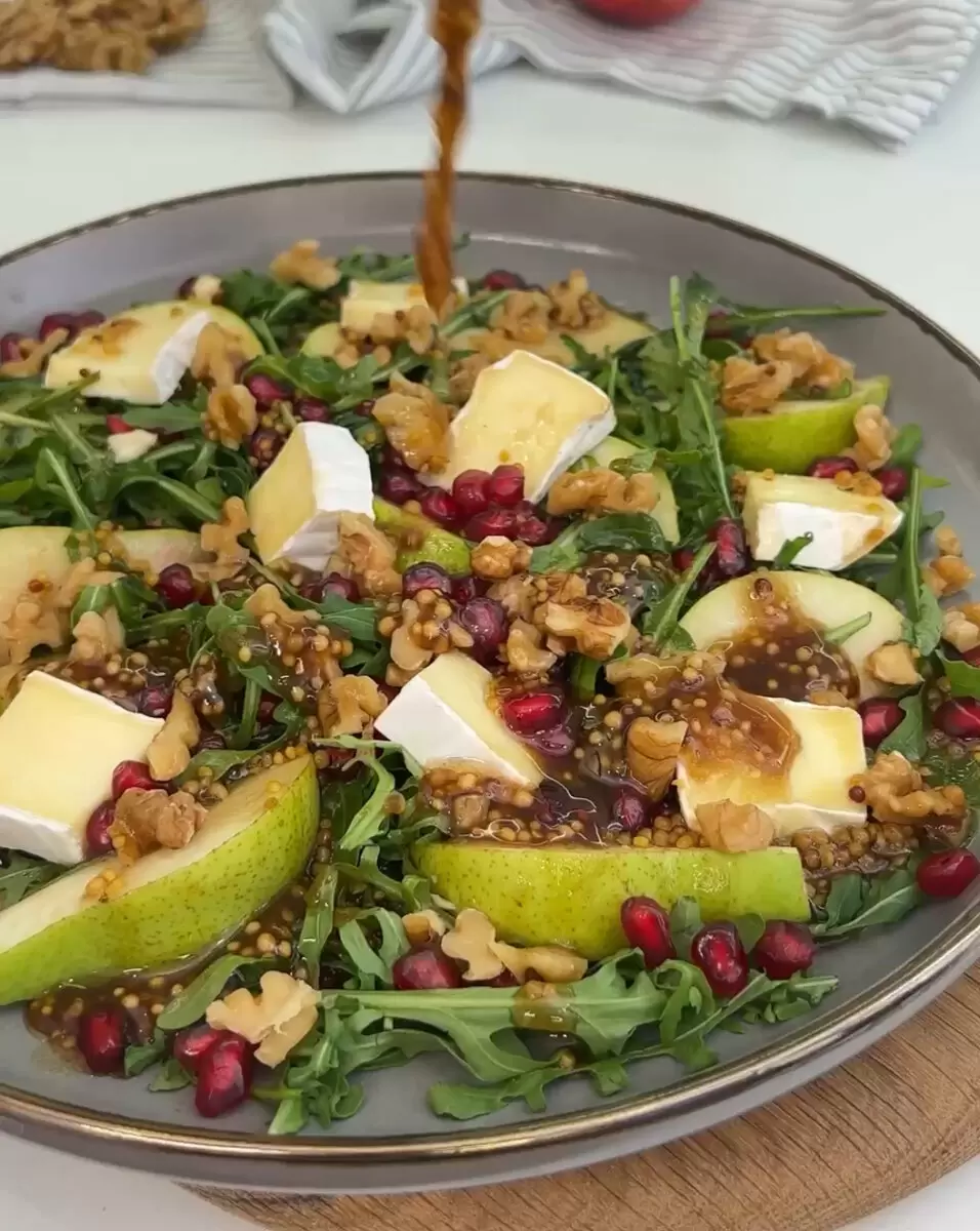 На широкой тарелке укладывается руккола, затем слоями добавляются груша, сыр, семена граната и крошеные орехи. Последним этапом идет заправка, которую можно равномерно распределить поверх блюда. Перемешивать не обязательно — все компоненты отлично пропитаются и подарят удивительное сочетание вкусов с первого укуса.