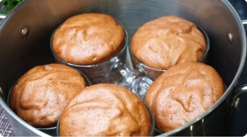 Теперь подготовьте формы: возьмите стаканы подходящего объема, смажьте их маслом и наполните тестом на 2/3. Далее, в большую кастрюлю положите тряпку на дно, установите стаканы, закройте крышкой и ставьте на огонь. Готовьте на среднем жаре около 25-30 минут после закипания. Чтобы кексы не потеряли свою воздушность, постарайтесь не открывать крышку в процессе выпечки.