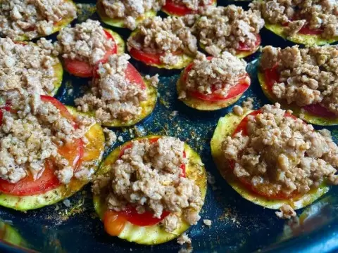 Противень застилается пергаментом (это необязательный, но весьма полезный шаг) и смазывается маслом. На противень выкладываются кружочки баклажанов, которые также следует немного посолить, поперчить и приправить специями. Сверху на баклажаны укладываются ломтики помидоров, а затем добавляется по столовой ложке фарша на каждый.
