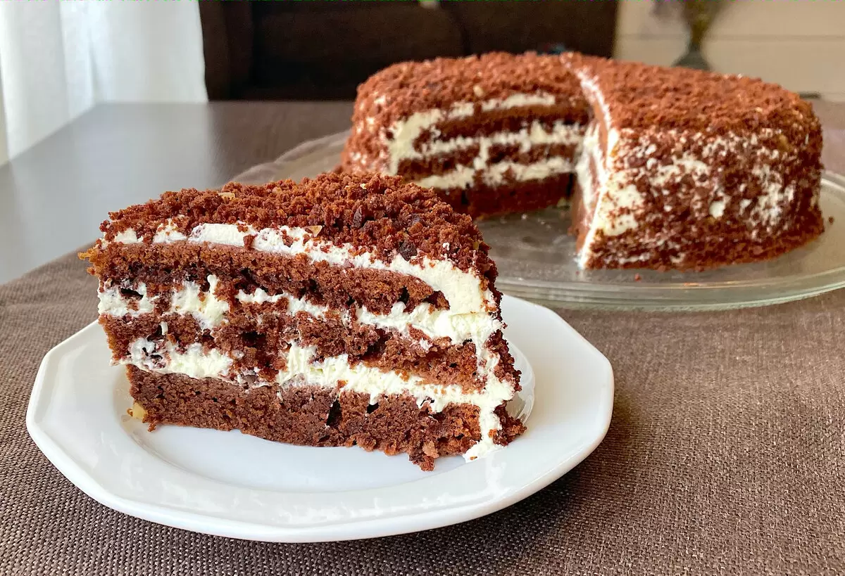 - Когда торт остынет, разрежьте его на три коржа и обрезанную верхушку оставьте для крошки. Промажьте слои любимым кремом.