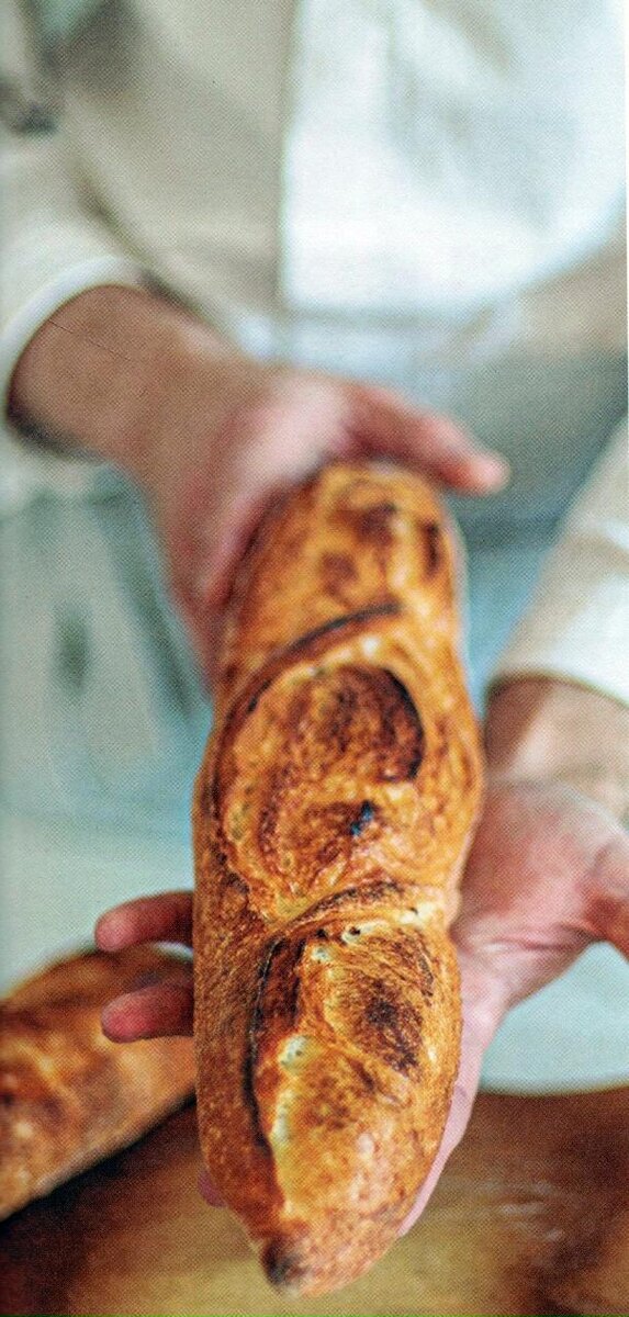 10. Выпекать багеты в нагретой духовке с паром в течение 8-10 минут, затем снизить температуру до 230 °C и продолжить выпекание до золотистой корочки.