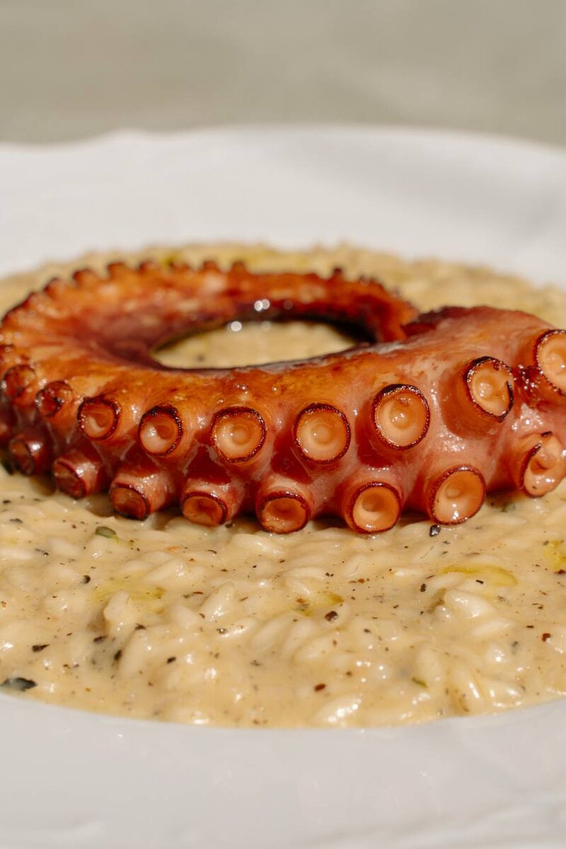 Ризотто к 'ачо э пепе' – это не просто очередное блюдо в меню ресторана, а настоящая кулинарная симфония. Секрет его успеха заключается в сочетании высококачественных ингредиентов и мастерстве повара. Мягкий кремовый рис, обогащенный комбинацией ароматного черного перца и сыра Пекорино, создает уникальный вкус, который невозможно забыть. Блюдо подается с невероятно аппетитным осьминогом, укутанным в карамельную корочку, что добавляет необычную нотку и визуальную привлекательность.
