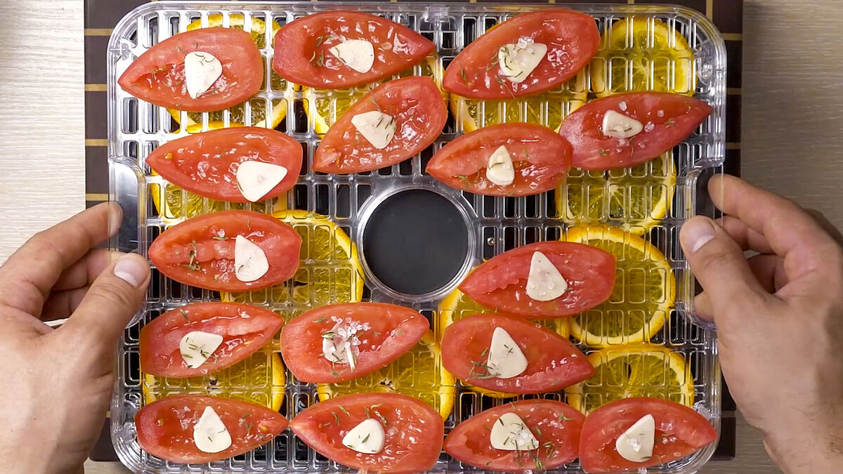 2. Нарежьте чеснок и апельсины тонкими кольцами. Разложите апельсиновые дольки на противне дегидратора, а помидоры на другом. Сверху на помидоры уложите чеснок и тимьян, не забудьте немного посолить их.
