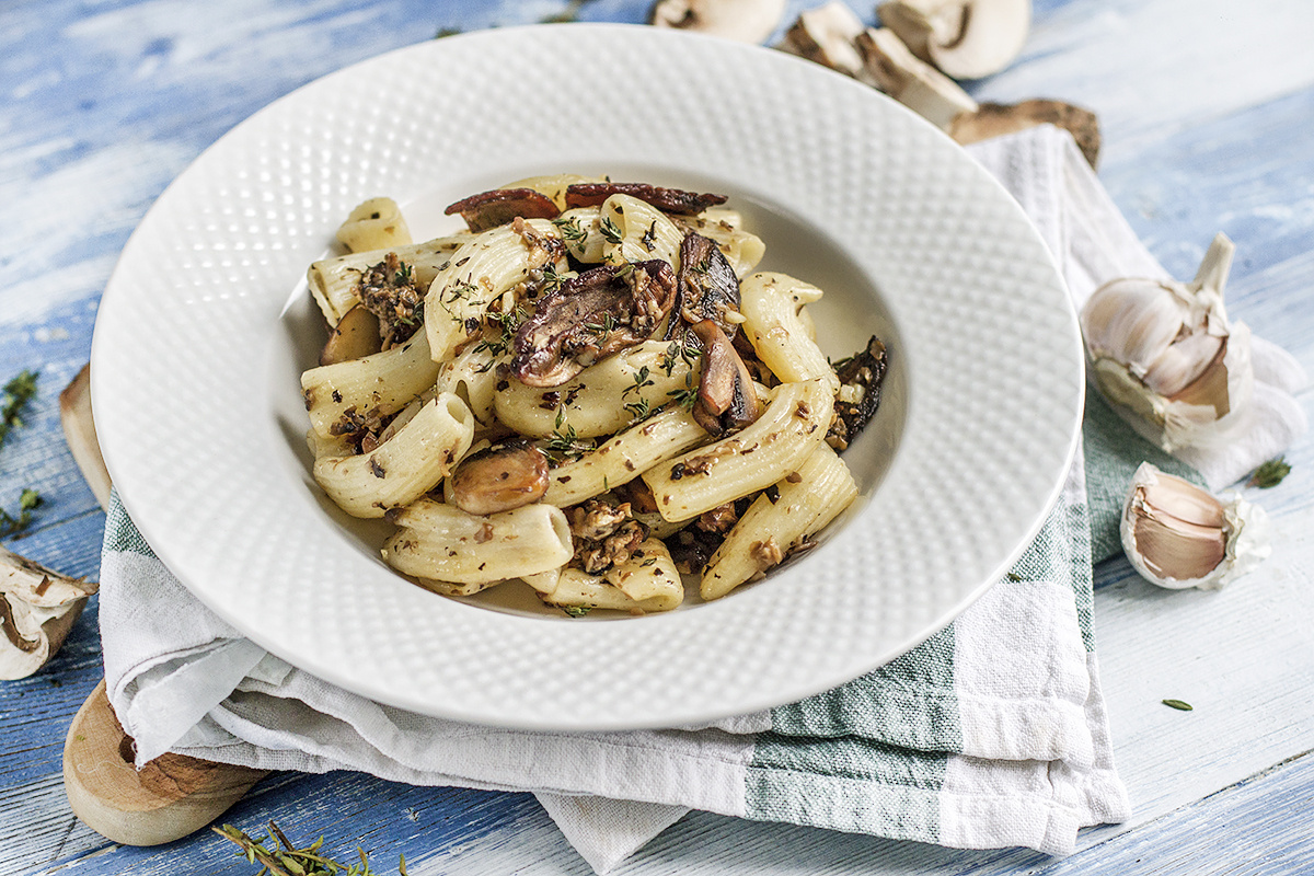 Во время варки нарежьте мелко лук и чеснок. Шампиньоны очистите, нарезав на произвольные кусочки. Разогрейте сковороду с одной столовой ложкой растительного масла и обжарьте лук в течение 1-2 минут до золотистого цвета. Затем добавьте белые грибы без жидкости, шампиньоны, чеснок, трюфельную пасту и тимьян. Приправьте солью и перцем по вкусу, а саму трюфельную пасту лучше сначала попробовать – ее насыщенный вкус может быть неожиданным. Жарьте смесь еще 3-4 минуты на сильном огне.