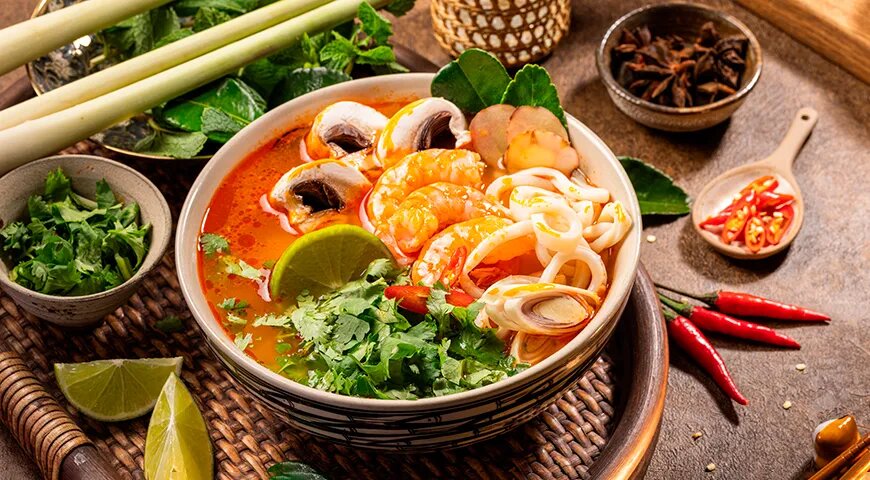 Том-ям — это не просто суп, а настоящая гастрономическая симфония, известная каждому любителю тайской кухни. Это блюдо покоряет сердца благодаря своему яркому вкусу и аромату, а также множеству возможных вариаций. Основные ингредиенты, как правило, включают лемонграсс, галангал, листья кафрского лайма, перец чили, а также морепродукты, курицу или рыбу.