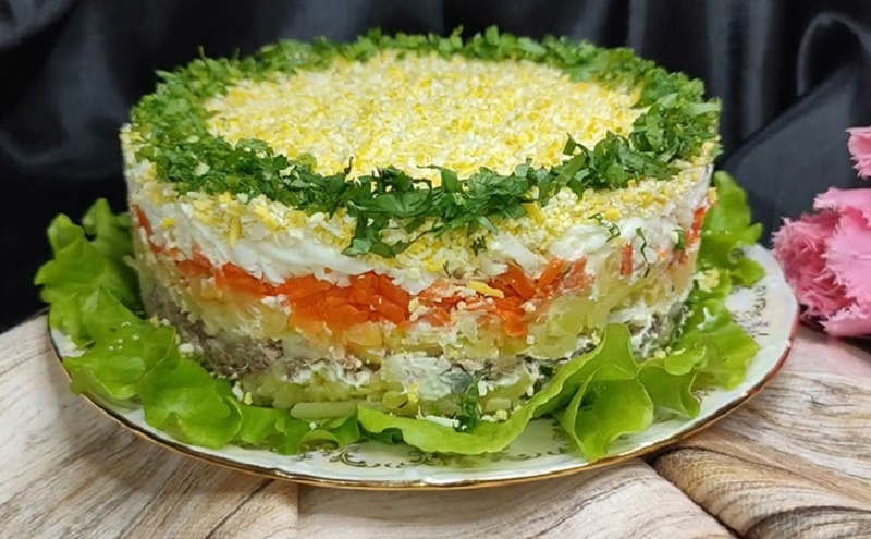 Когда все составляющие готовы, следует перейти к сборке салата. Начало укладки — картофельный слой, который аккуратно необходимо утрамбовать и смазать майонезом. Далее аккуратно помещаются сардины, лук, натертые яичные белки, морковь и завершает оформление слой желтков. Не забудьте оставить салат в холодильнике на 1-2 часа, чтобы он смог пропитаться и раскрыть все свои вкусовые ноты.