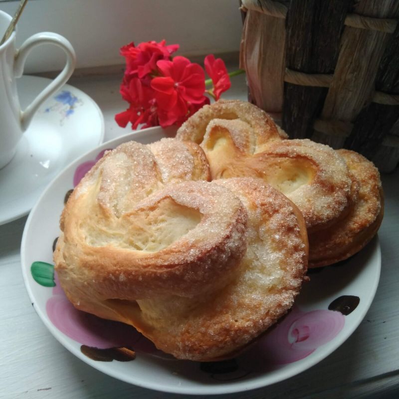 Выкладываем плюшки на противень с силиконовым ковриком, накрываем и оставляем расстаиваться на 20 минут. Для выпечки разогреваем духовку до 180 градусов и готовим плюшки около 20 минут. Готовые изделия снимаем с противня и накрываем полотенцем до полного остывания. Приятного аппетита!