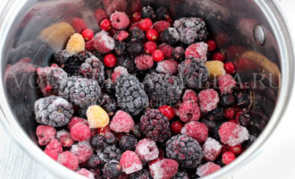 Готовим ягодное пюре — использовать можно любую комбинацию ягод: ежевику, малину или смородину. Ягоды помещаются в сотейник, где их осторожно прогревают. После нагревания их необходимо протереть через сито, чтобы избавиться от кожуры и семян. Полученное чистое пюре должно составить около 169 г. В отдельной миске смешивают сахар и желфикс, который отвечает за хорошую текстуру меренги.