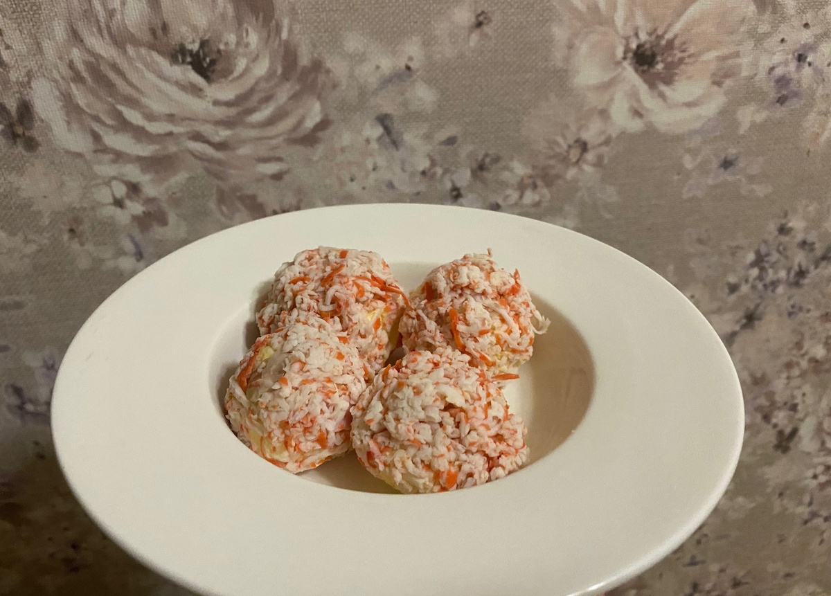 Теперь пришло время формировать закуску. Сформируйте небольшие шарики из получившейся смеси, а затем обваляйте их в натертых крабовых палочках для хрустящей текстуры. Ваше необычное Рафаэлло готово!