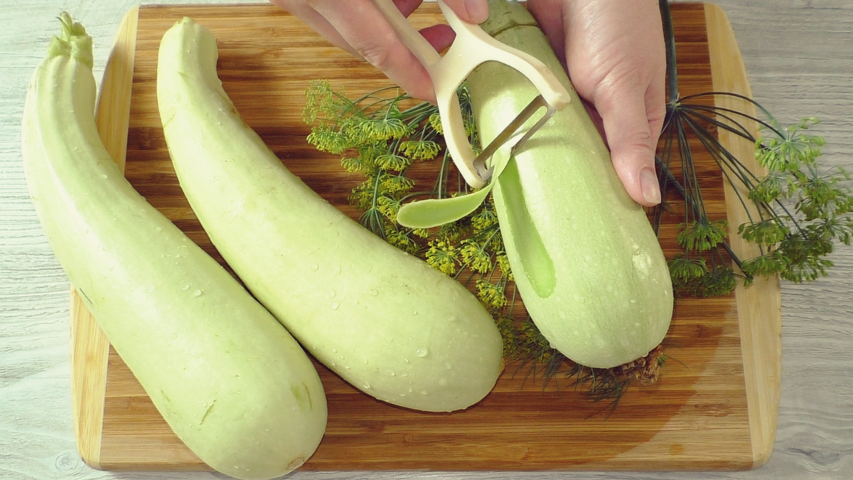 - Не нужно снимать шкурку с молодых кабачков. Нарежьте их на удобные куски для натирки.