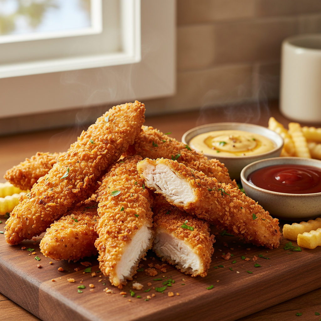 Эти домашние куриные стрипсы подарят вам настоящую гастрономическую радость, соединяя нежную куриную грудку с хрустящей золотистой корочкой. Сам секрет их идеальной текстуры — в маринаде на основе пахты, который делает мясо мягким, а двухслойная панировка из сухарей Панко обеспечит ту самую идеальную хрусткость. Эти стрипсы — идеальный выбор для вашего следующего уикенда, вечеринки или просто уютного ужина с любимыми!