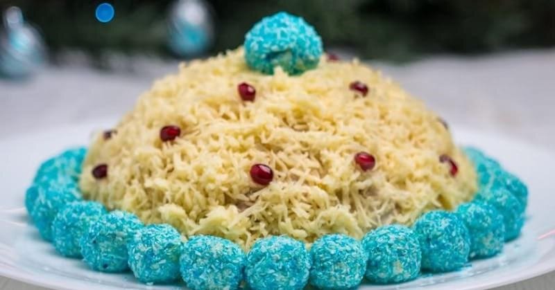 Перед подачей к столу салат следует оставить в холодильнике на около часа. Для разнообразия, белые шарики можно приготовить аналогично — просто обваляв в тертых белках без раскраски. Главные цвета Снегурочки – белый и голубой, так что оба варианта будут выглядеть эффектно.
