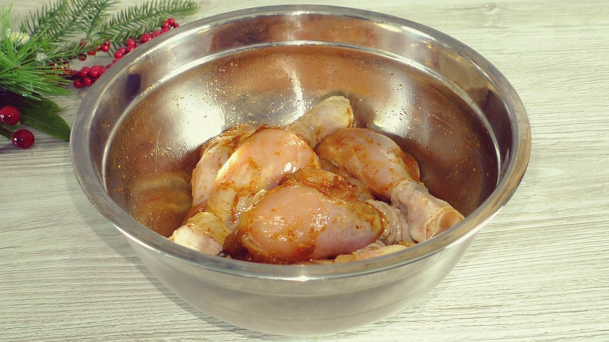 После этого курицу маринуют с добавлением соевого соуса и специй. Соль не требуется, так как соус сам по себе достаточно соленый. Голени оставляют на 20 минут при комнатной температуре для лучшего впитывания вкусов.
