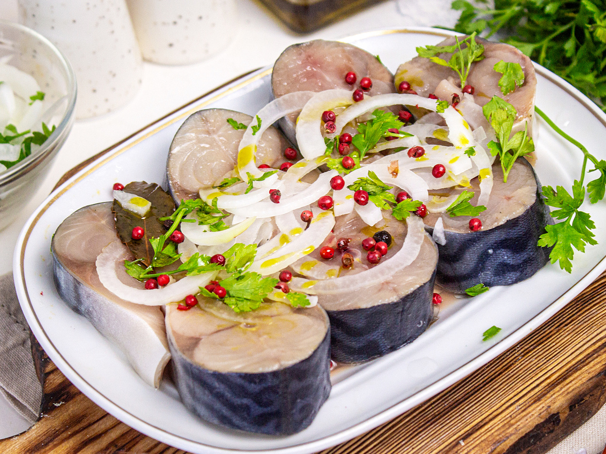 Скумбрия отлично подходит для подачи с отварной картошкой или просто с хлебом. Чтобы усилить вкус, можно добавить кольца маринованного лука в качестве гарнира.