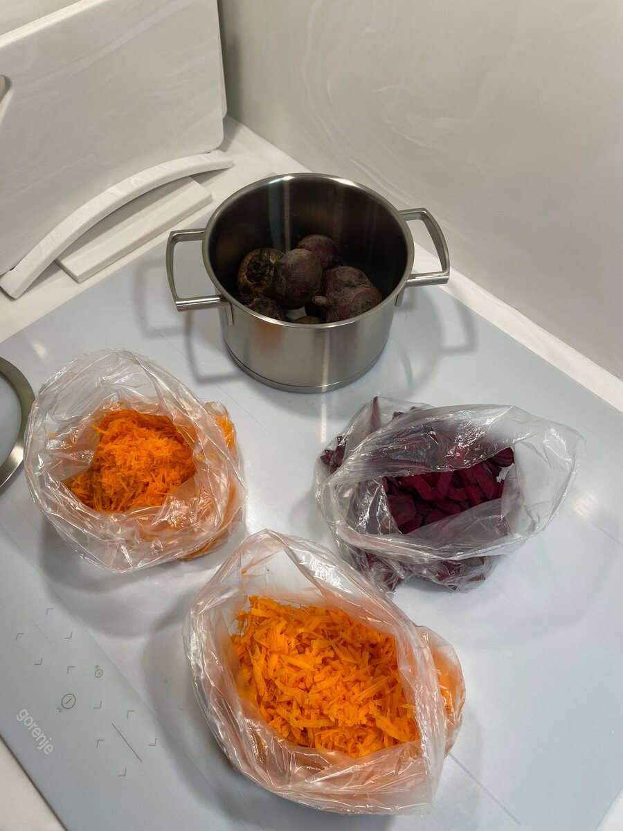 Многие хозяйки находят, что время, проведенное на кухне, можно оптимизировать с помощью простых заготовок. Не так давно, например, была сделана замечательная мини-заготовка: натертая морковка и нарезанная свекла, готовые к заморозке на будущие кулинарные шедевры.