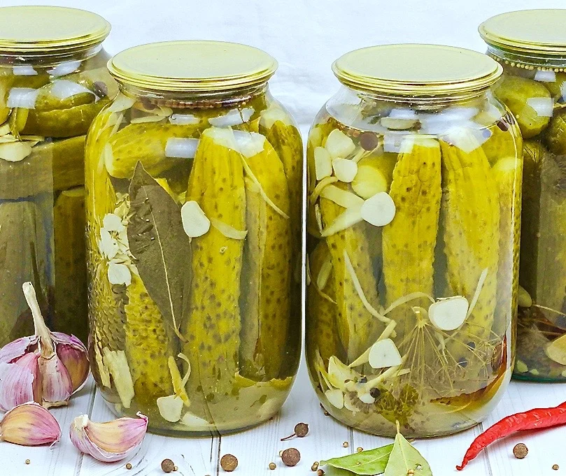 Как и в предыдущем рецепте, огурцы замачиваются, затем помещаются в банки, которые стерилизируются в горячей воде, чтобы консервированные огурцы сохраняли свои качества на протяжении длительного времени.