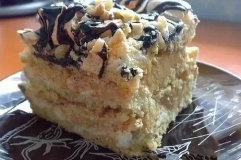 Создать мягкое тесто, взбивая 6 желтков с 1,5 стаканами сахара. Влить 250 г мягкого маргарина, добавить столовую ложку майонеза, чайную ложку гашеной соды, ваниль и 3 стакана муки. Разделить на 3 части и оставить в холодильнике на полчаса.Тем временем взбить 6 белков до крепкой пены, постепенно добавляя 2 стакана сахара.Взять одну часть теста, распределить её на противне и покрыть 1/3 белковой массы, выпекать на низкой температуре. Повторить с остальными частями, чтобы получить 3 коржа.Для крема взбить 200 г масла с банкой вареной сгущенки. Намазать половину крема на первый корж и посыпать рублеными орехами. То же сделать со вторым коржом, а на третий – разнообразно нанести глазурь и украсить орехами.Рекомендуется оставить торт на ночь для наилучшего вкуса (если он переживет до этого момента).Поделитесь этим рецептом с друзьями, пригласите их готовить вместе с вами!