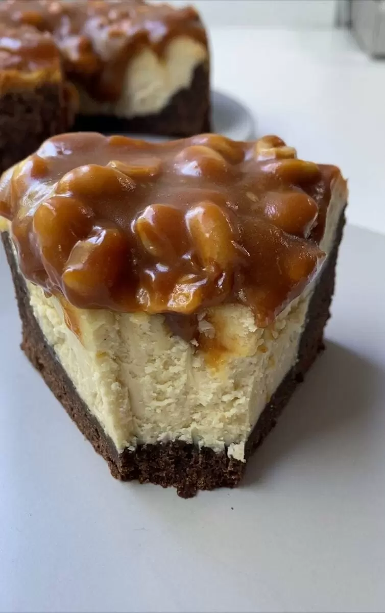 Затем карамель или варёную сгущёнку смешивают с солёным арахисом и выкладывают на остывший чизкейк. Для удобства нарезки, десерт можно охладить в холодильнике на 30-60 минут.