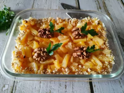 Снова смажьте майонезом и добавьте тертый сыр, а затем — еще один слой майонеза и завершающий штрих — обжаренные ананасы. Для красоты украсьте салат грецкими орехами и свежей петрушкой.