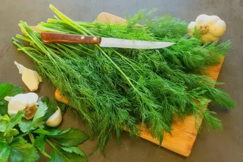 - Свежесобранные травы: укроп, петрушка, любисток, тимьян, розмарин, майоран, базилик, листья сельдерея, измельченный чеснок и др.;