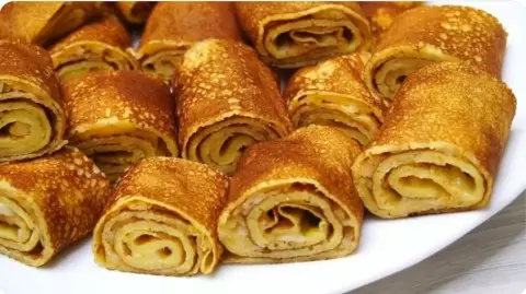 По прошествии 5 минут разогреть сковороду, смазав её небольшим количеством масла, и выпекать блинчики как обычные блины. Эти блины прекрасно держат форму и поддаются переворачиванию. Из указанного количества теста получится 4-5 блинчиков. Начинять их можно всем, что угодно. Например, можно сделать с сыром, посыпав натертым сыром ещё горячий блин и свернув его в рулет.
