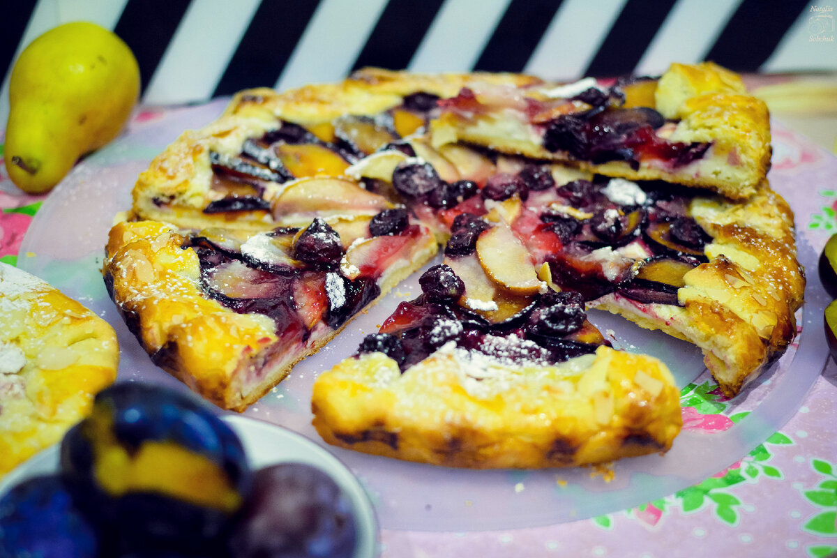 Охлаждённое тесто раскатывается на пергаменте в круг диаметром около 35 см. На середину выкладывается творожная начинка с фруктами. По желанию, сверху можно посыпать сахаром и крахмалом, завернув края теста на начинку. Гладкие края можно поверх смазать молоком и украсить миндальными хлопьями. Выпекается в разогретой до 180°C духовке около 35 минут, после чего десерт стоит остудить и посыпать сахарной пудрой перед подачей.