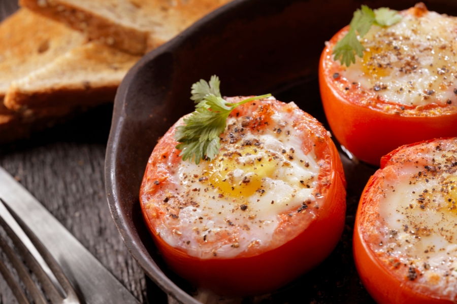 - Начините помидоры полученной смесью и сверху аккуратно вбейте яйцо.
