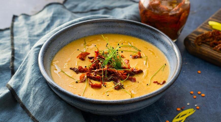 В большой кастрюле с толстым дном обжарьте мелко нарезанные овощи в масле от вяленых помидоров до достижения мягкости, это займет около 5 минут. После этого добавьте чечевицу и подготовленный хлеб, залейте овощной бульон или воду, доведите до кипения и варите до полной мягкости чечевицы. Не забудьте добавить соль по вкусу, а затем взбейте суп до однородной консистенции с помощью блендера.